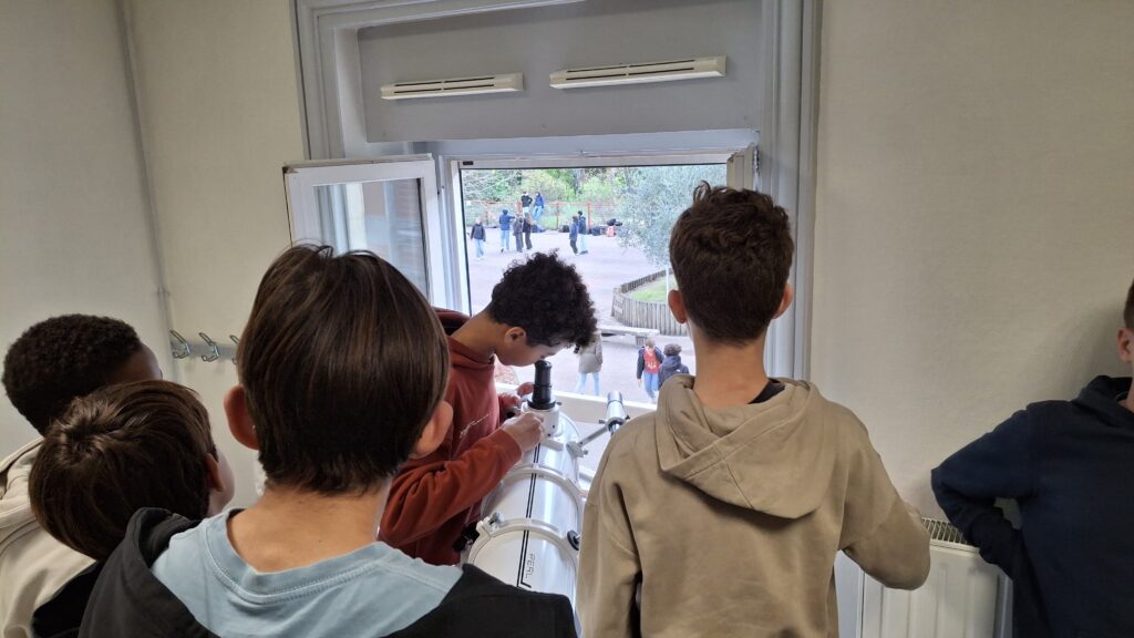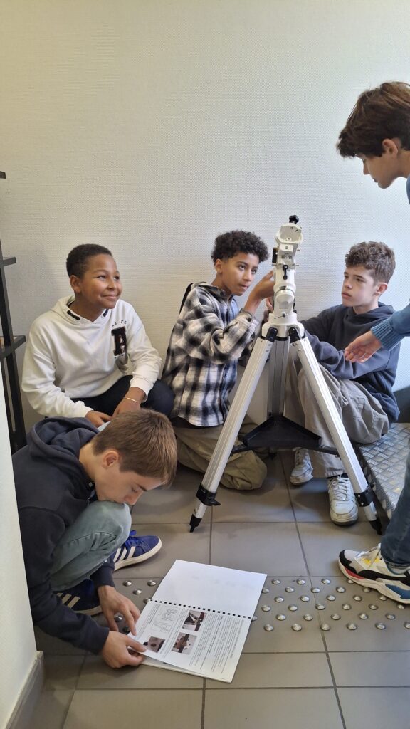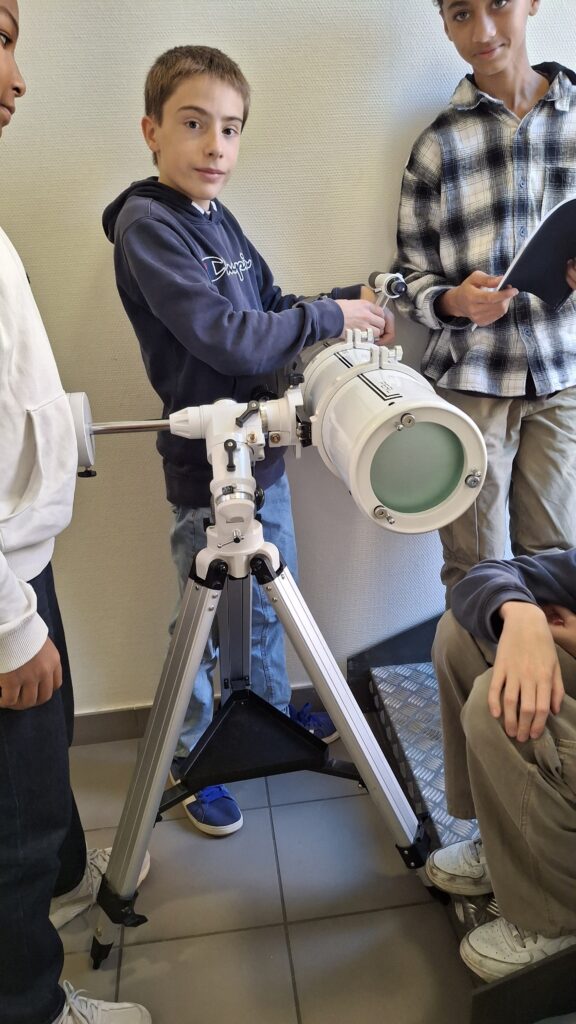 Lors de la séance précédente, les élèves avaient déjà appris à installer le télescope, en découvrant les différentes étapes de montage : trépied, monture et contre-poids. Cette progression pas à pas leur permet aujourd’hui de gagner en autonomie et en précision dans la manipulation du matériel.